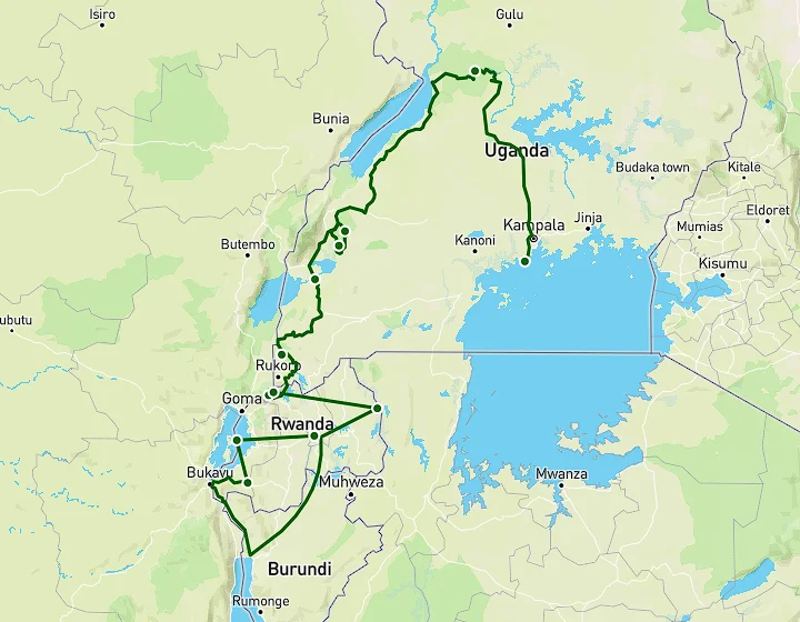 You continue to Queen Elizabeth National Park, where the realm of lions awaits. Home to an array of Africa’s famous creatures, including buffaloes, elephants, and leopards, the park offers thrilling game drives and captivating boat cruises along the Kazinga Channel. From Queen Elizabeth National Park, you connect to the UNESCO World Heritage site of Bwindi Impenetrable National Park via the Ishasha sector of Queen Elizabeth NP, where if you are in luck encounter the tree-climbing lions. In Bwindi, you’ll encounter the renowned mountain gorillas in their natural cradle. But the wonders of Bwindi don’t end there – with its remarkable biodiversity, including chimpanzees, forest elephants, and an array of birdlife, this park promises a truly immersive wildlife experience. From Bwindi, the safari crosses over to Rwanda – to Volcanoes National Park where you can potentially do a second mountain gorilla trek. However, you are here to see the awe-inspiring golden monkeys. From here, continue to Akagera National Park where you enjoy a classic African game drive to see what Rwanda has done to revive and conserve her only savannah game park. From Akagera, you drive across Rwanda via the capital, Kigali – headed to Nyungwe National Park. In Nyungwe, you track chimpanzees and walk on a raised canopy to see the forest from a super vantage point. Your safari concludes with a day to relax on the shores of Lake Kivu before arriving in Kigali and heading home.